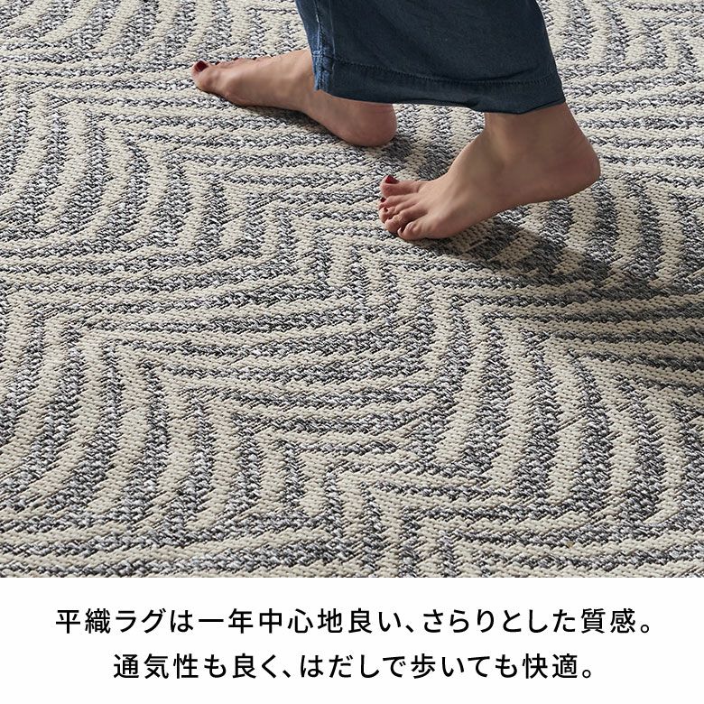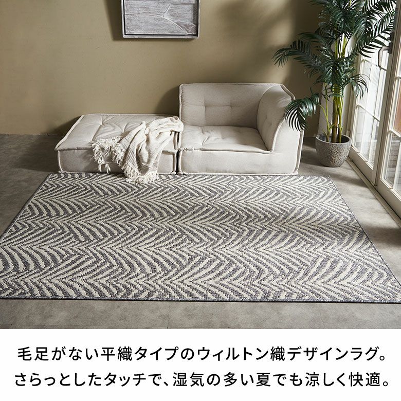 糸を贅沢に使ったウィルトン織は、密度が高くとても丈夫。素材には耐久性が高いポリプロピレンを使用しているため、長く愛用できます。平織タイプなのでさらっとしたタッチで、湿気の多い夏でも涼しく快適。通気性もよく、日々のお掃除も簡単です。床暖房も対応で、夏だけでなくオールシーズンお使いいただける、実用性に優れたラグです。
