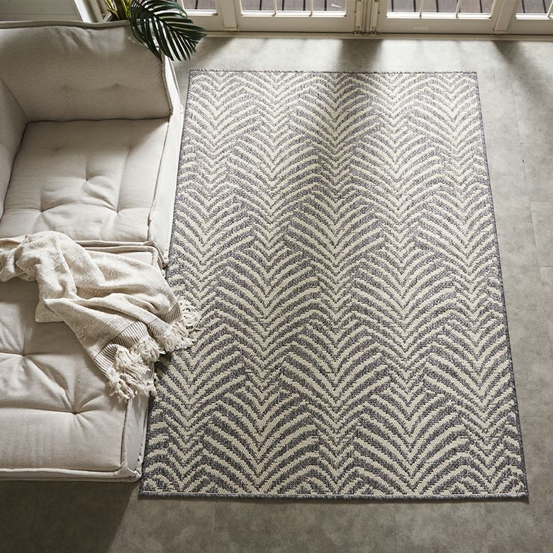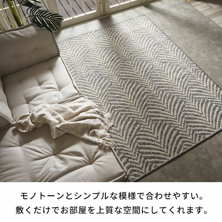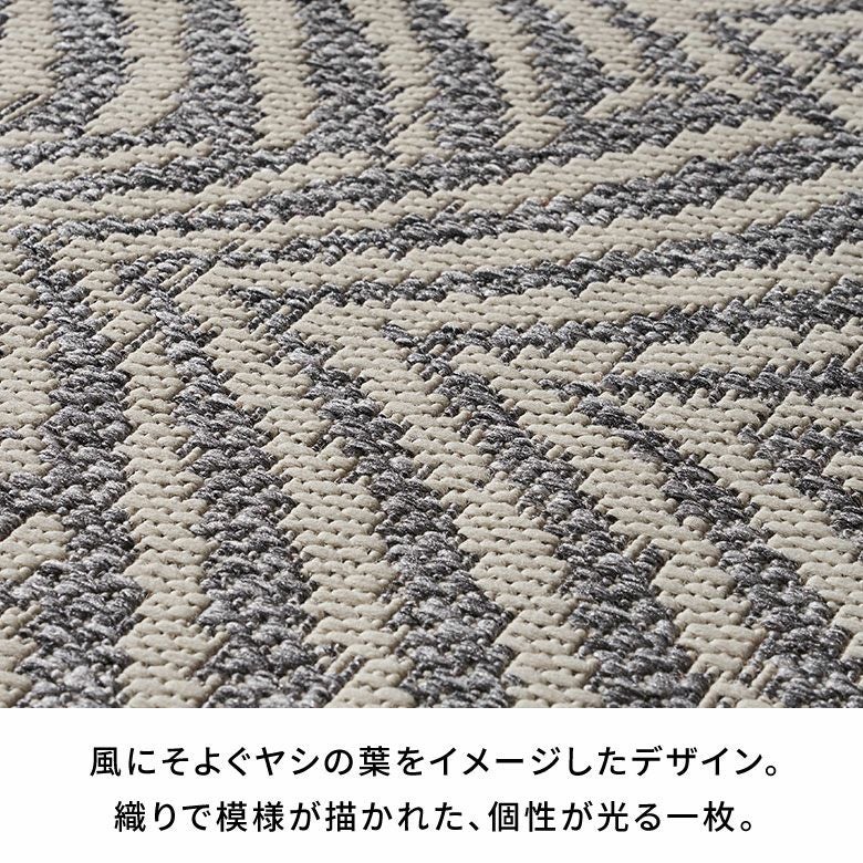 風にそよぐヤシの葉をイメージしたデザインラグ。毛足の色ではなく色糸による織りで模様を描いており、さりげない個性が光る一枚です。モノトーンの色味とシンプルな模様で、アジアンから北欧テイストまで様々なテイストのインテリアに合わせやすいので、デザインラグ初心者の方にもおすすめ。プリントではなく織りだからこそできる、高級感のあるデザイン表現が楽しめます。