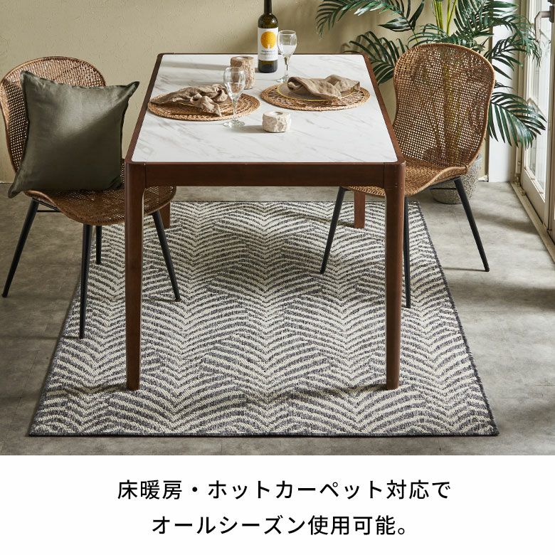 毛足がない平織タイプなので掃除がしやすく、ダイニングテーブルの下にぴったり。目を引くアクセントとしてお使いいただけます。