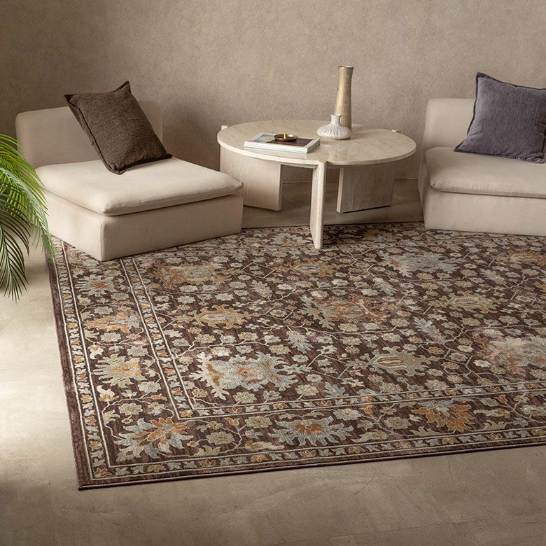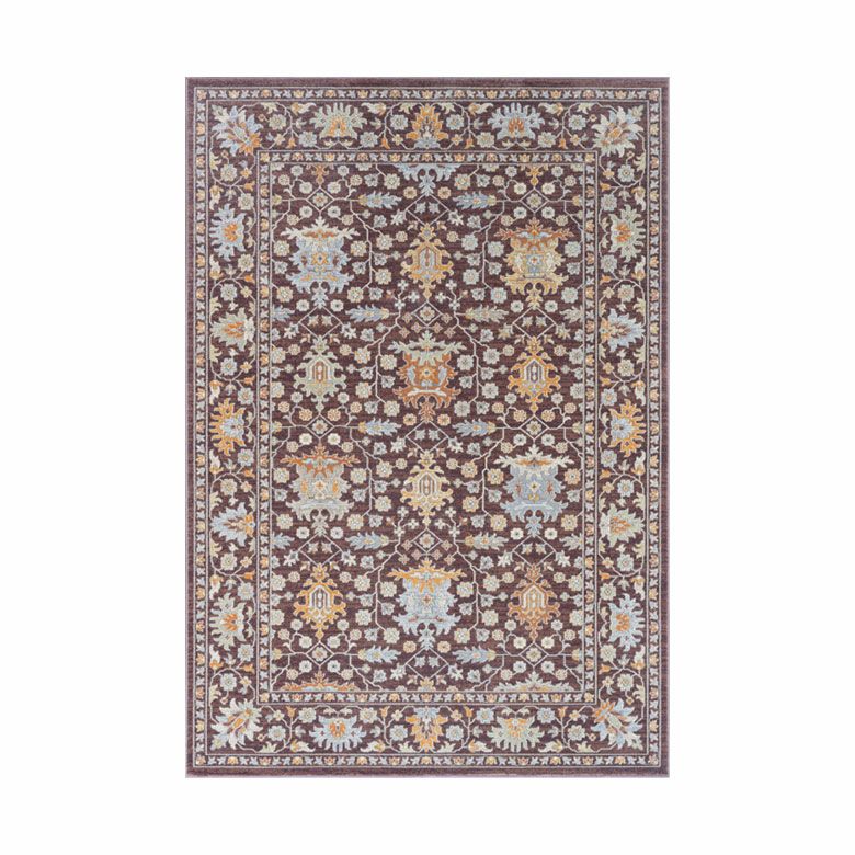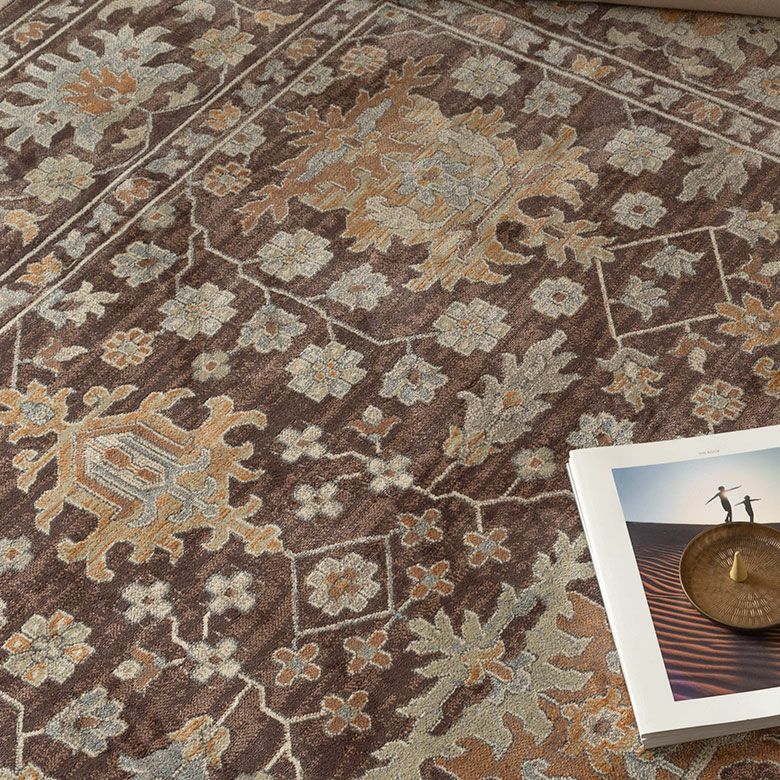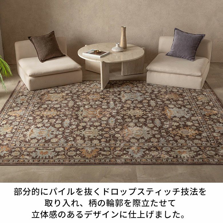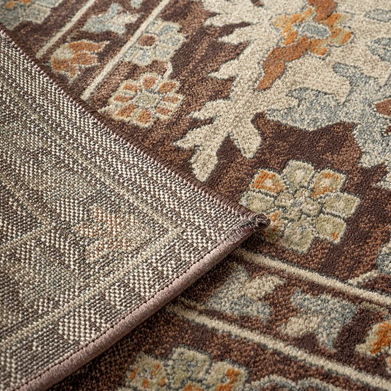 赤みを帯びたブラウンを基調に、ブルーグレーやオレンジのモチーフを織り込んだクラシックなペルシャ風デザイン。ヨーロッパ製ならではの繊細な色使いで、複数の色糸を組み合わせて織ることで、深みのあるニュアンスカラーが上質で洗練された印象を与えます。