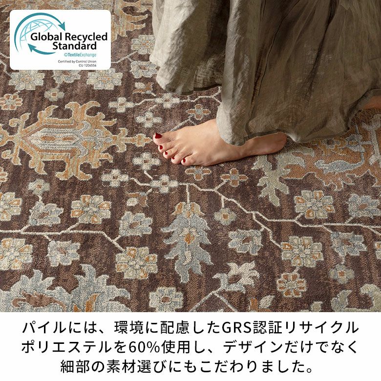 素材には、しっとりした滑らかな肌触りのポリエステルを使用。さらに、原料の約60%にリサイクル素材を採用し、デザインだけでなく素材選びにもこだわった、サステナブルなウィルトン織ラグです。