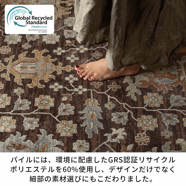 環境に配慮した高品質な素材を使用するためパイルの60%は、GRS(Global Recycle Standard)認証リサイクルポリエステルを使用し、デザインだけでなく細部の素材選びにもこだわりました。原料の追跡が可能で、リサイクル素材でありながら上質な品質が保証されている、サステナブルで信頼のあるラグです。