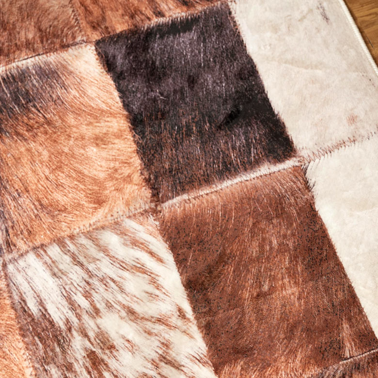 ラグジュアリーなハラコ風のパッチワークを表現したデザインラグ。