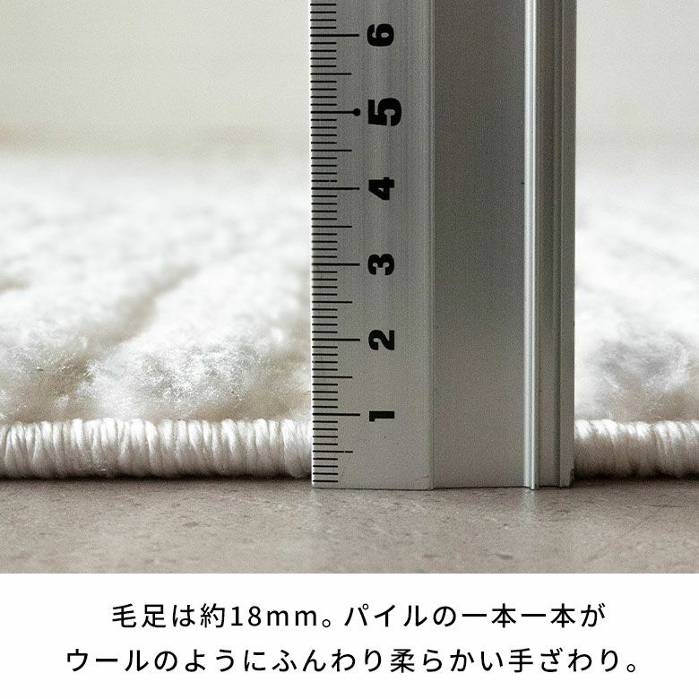 ノット数72,000の普及品クラス。しわになりにくくなめらかで、やさしい肌ざわりのポリエステル糸を使用。水や汚れに強く、遊び毛も出にくいためお手入れも簡単。パイルの長さは約1.8cmで、掃除のしやすさと快適さを両立。冬はホットカーペットカバーとしても活躍し、床暖房との併用も可能なので、一年を通して快適に使えます。