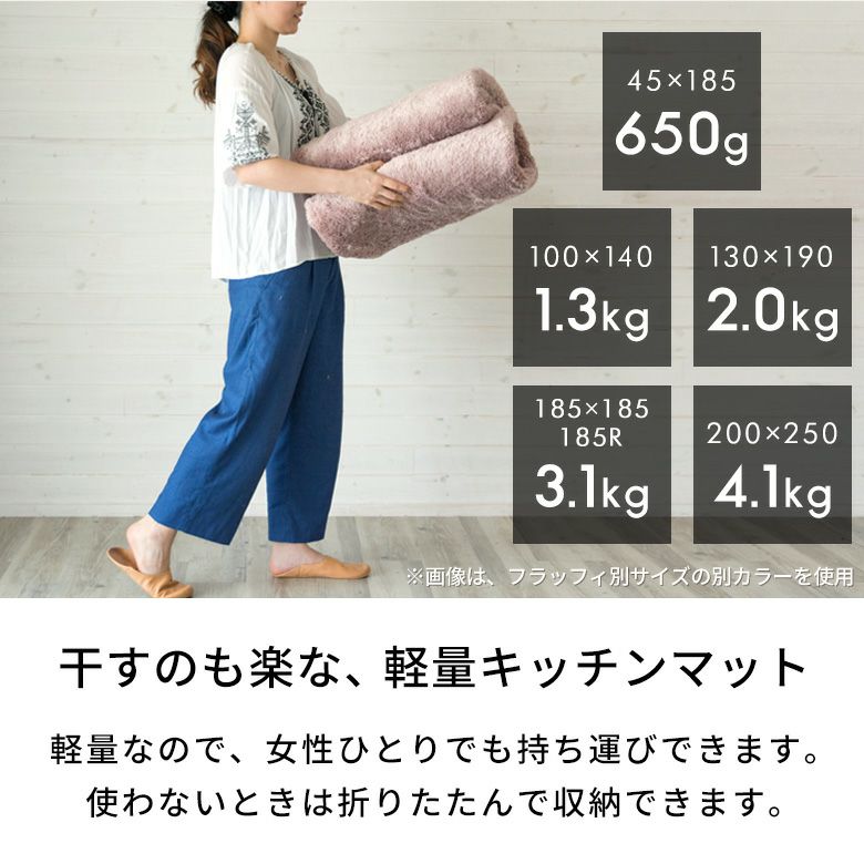 特徴:なめらかな肌触りを追求したフラッフィシリーズにキッチンマットサイズが新登場。丸洗いできて清潔さを保てます。