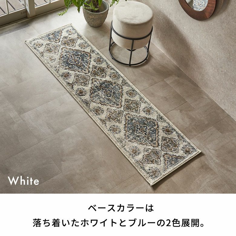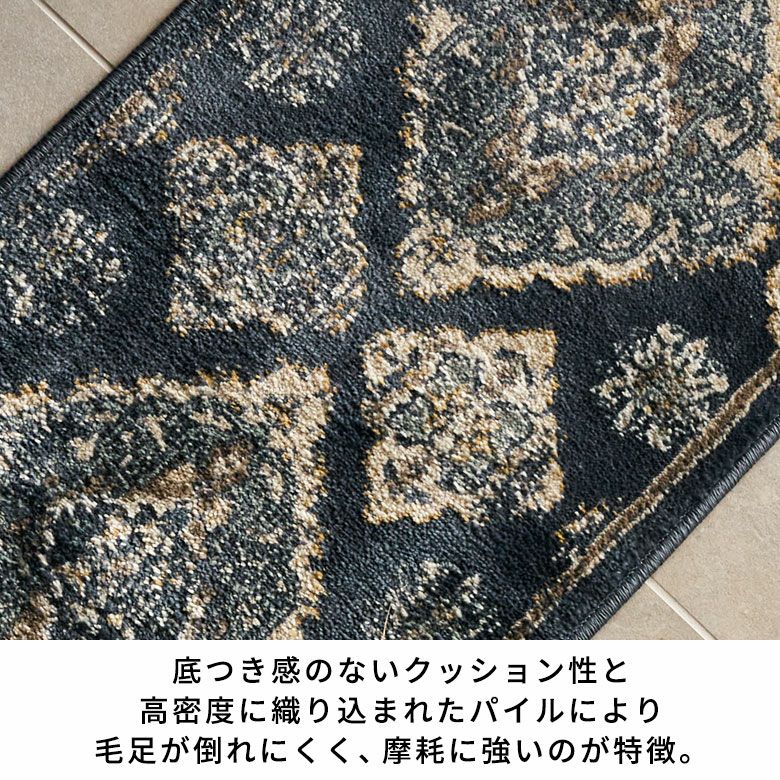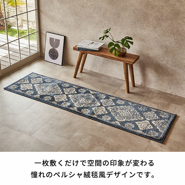 約50×180cmの一般的なキッチンマットサイズ。キッチンはもちろん、廊下やベッドサイドにもおすすめで、自由なコーディネートをお楽しみいただけます。アラベスク柄の主張しすぎない“擦れ感”が、この商品ならではの魅力。一枚敷くだけで空間の印象が変わる憧れのペルシャ絨毯風デザインです。