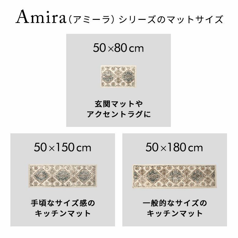 同じ「Amira」マットシリーズには、廊下やベッドサイドなど最適な約50x150cmのキッチンマットや、使いやすいサイズ感の約50×80cmの玄関マットもございます。