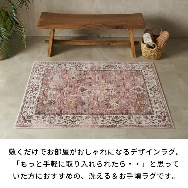 ヴィンテージラグの風合いを、“手軽に・清潔に”楽しめるラグマット。繊細な模様と深みのある色合いを転写プリントでリアルに再現し、本物のような重厚感と高級感を実現しました。