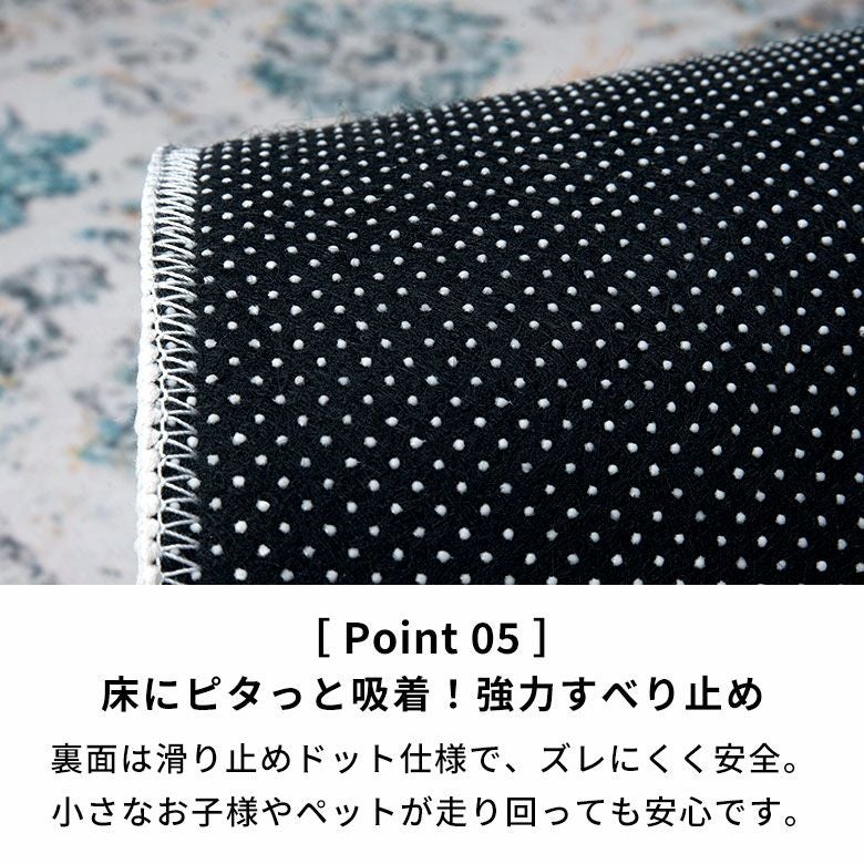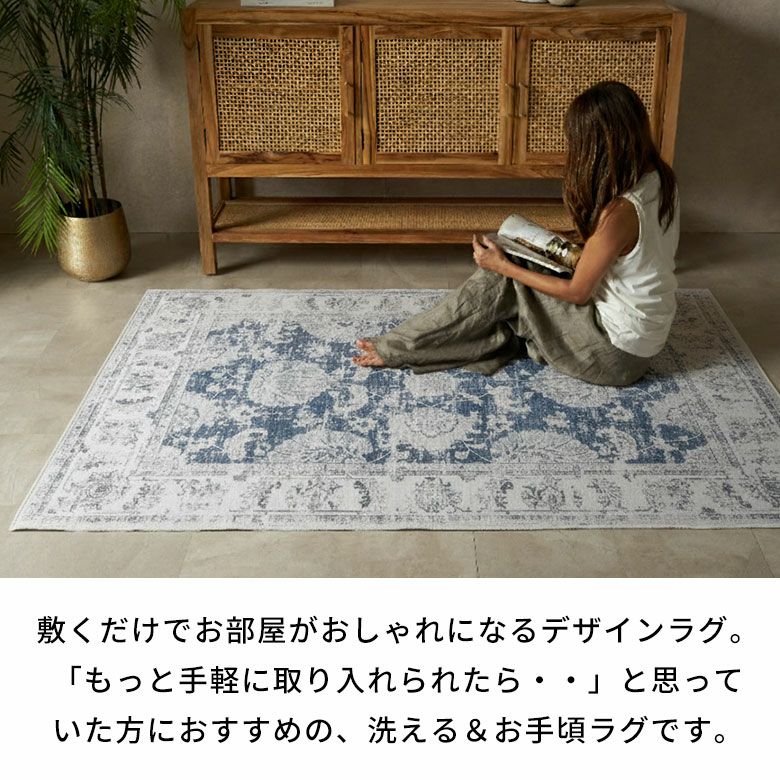 ヴィンテージラグの風合いを、“手軽に・清潔に”楽しめるラグマット。繊細な模様と深みのある色合いを転写プリントでリアルに再現し、本物のような重厚感と高級感を実現しました。