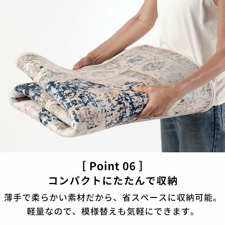 薄手で柔らかい素材だから、畳んで省スペースに収納できます。130×190cmサイズでもこんなにコンパクトに!(上記写真) さらに軽量なので、季節や気分で模様替えしたいときにも手軽に入れ替えできます。 洗い替え用に柄違いを揃えるのもおすすめです。