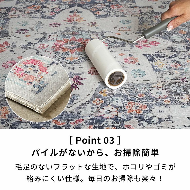 毛足のないフラットな生地で、ホ コリやゴミが絡みにくい仕様。 掃除機やお掃除ロボットもスムーズに動き、粘着カーペットクリーナーでも簡単にお掃除できるから、毎日のお手入れがラクに。 ダイニングテーブル下にも最適で、椅子の出し入れもスムーズです。