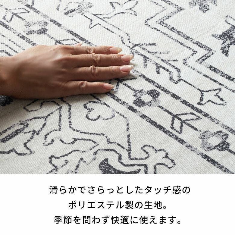 床暖房・ホットカーペット対応だから、足先から冷える真冬でも安心。 さらっとした肌触りで夏は涼しく、冬はぬくもりを感じられる一年中使える仕様。 季節を問わず敷きっぱなしで快適に過ごせます。