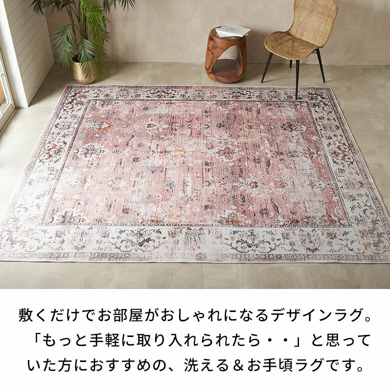 ヴィンテージラグの風合いを、“手軽に・清潔に”楽しめるラグマット。繊細な模様と深みのある色合いを転写プリントでリアルに再現し、本物のような重厚感と高級感を実現しました。