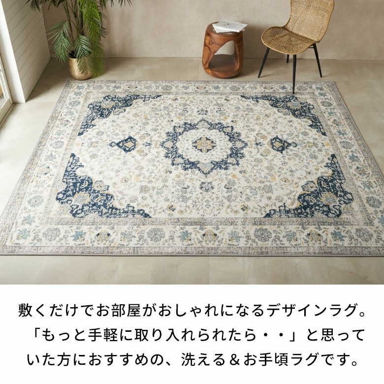 ヴィンテージラグの風合いを“手軽に・清潔に”楽しめる ペルシャ絨毯風ウォッシャブルラグマット!リビングをおしゃれに彩るオリエンタル柄 床暖房対応で年中快適 滑り止め付き 長年使いこんだようなかすれを再現したアンティーク風デザインのおしゃれなラグカーペット/約200x250cm 洗濯機で丸洗いOK 薄手で簡単お掃除&一年中使える 軽くて畳めてラクラク収納ラグマット [84401-e]