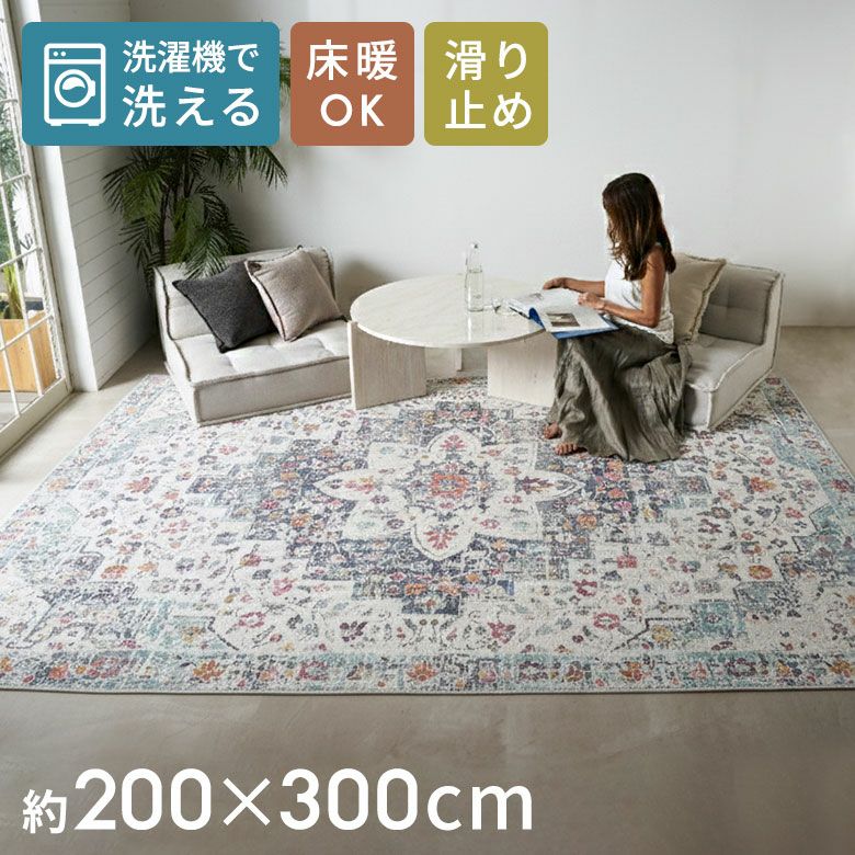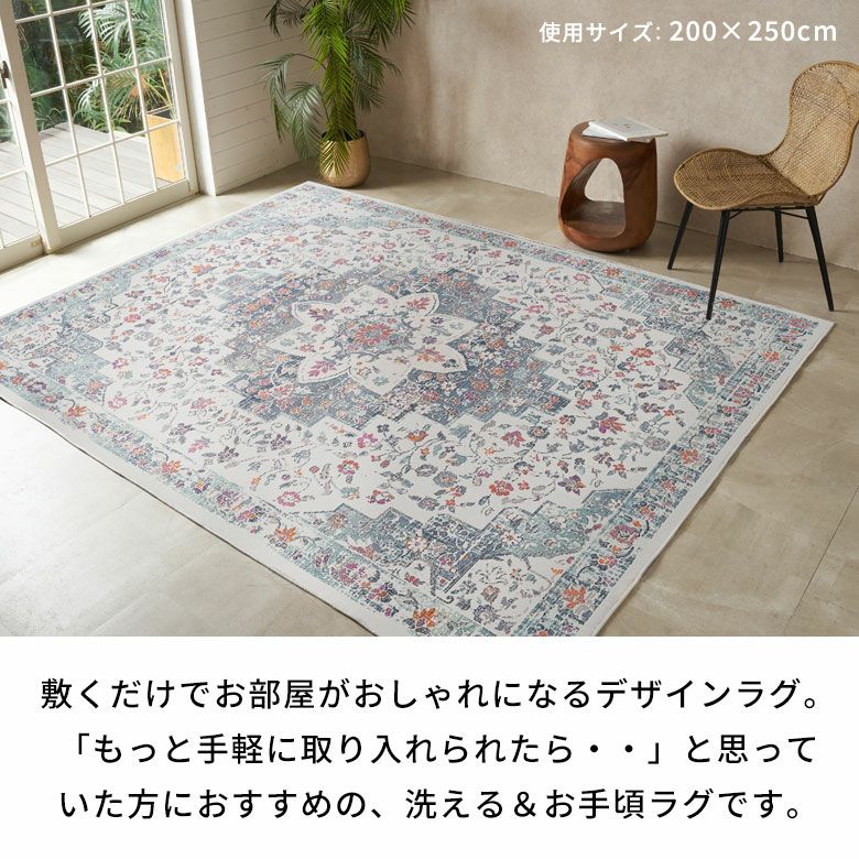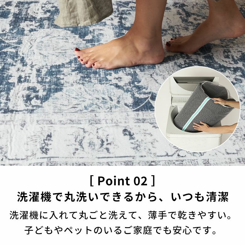 ヴィンテージラグの風合いを、“手軽に・清潔に”楽しめるラグマット。繊細な模様と深みのある色合いを転写プリントでリアルに再現し、本物のような重厚感と高級感を実現しました。