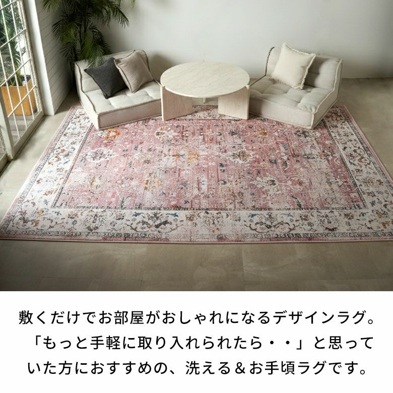 ヴィンテージラグの風合いを、“手軽に・清潔に”楽しめるラグマット。繊細な模様と深みのある色合いを転写プリントでリアルに再現し、本物のような重厚感と高級感を実現しました。