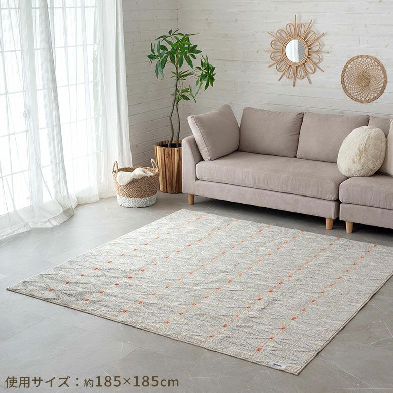 防ダニ加工や丸洗い洗濯可能など、機能面も充実しています。 ドットのアクセントが効いた幾何学模様でお部屋を彩って