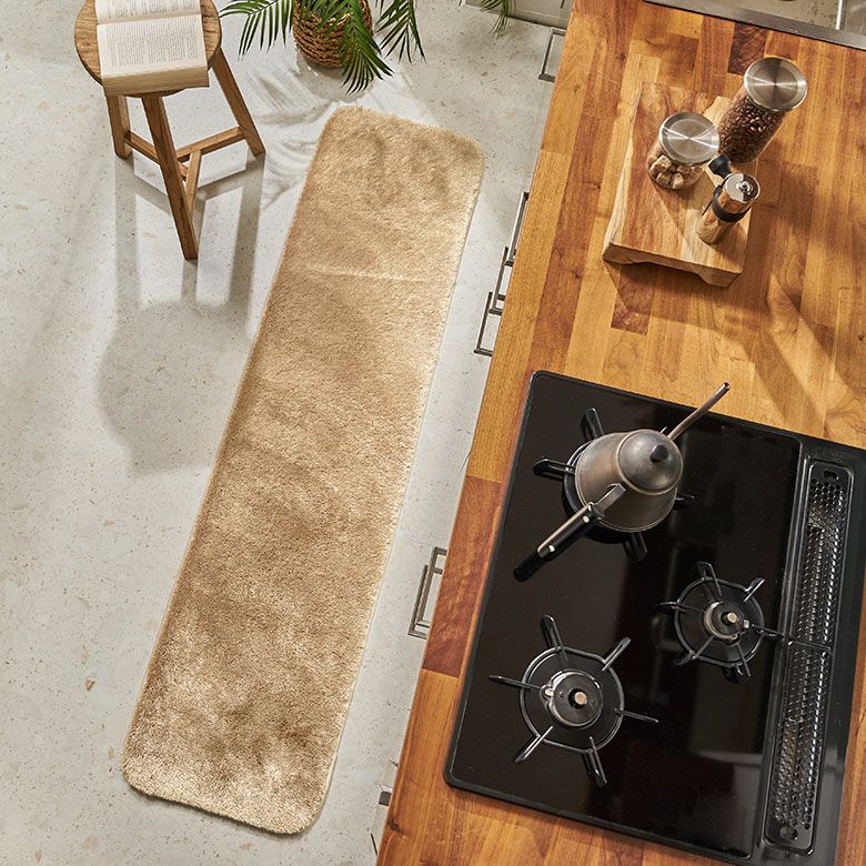 シンプルな無地のキッチンマットは、どんなインテリアにも合わせやすいアイテムです。家具の素材を選ばずにお使いいただけますが、特に自然素材や木材の家具との相性が抜群です。