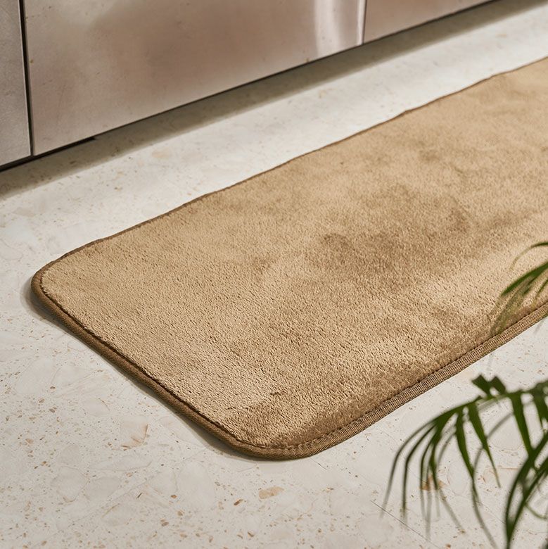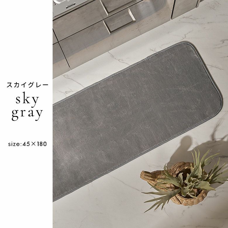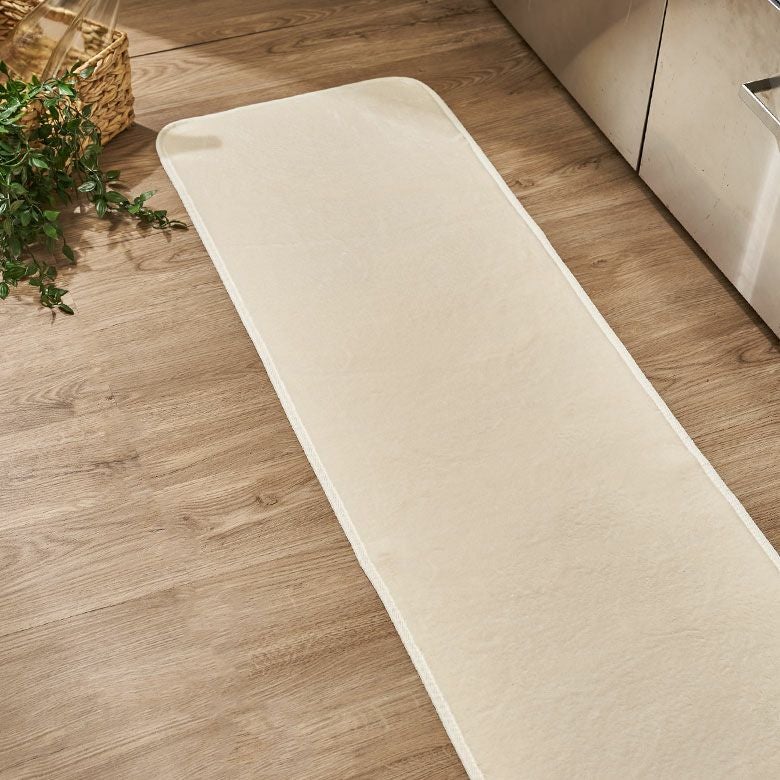 裏面はすべり止め付き。細長いサイズはキッチンでの利用以外にもベッドサイドのマットやごろ寝マットとしてもおすすめ。お部屋を広く見せてくれるアイボリー、クールなイメージを演出できるスカイグレー、落ち着いた空間に馴染むライトブラウンの3色をご用意しました。インテリアのテイストを選ばない、ベーシックなキッチンマットはお部屋のイメージチェンジにぴったりです。