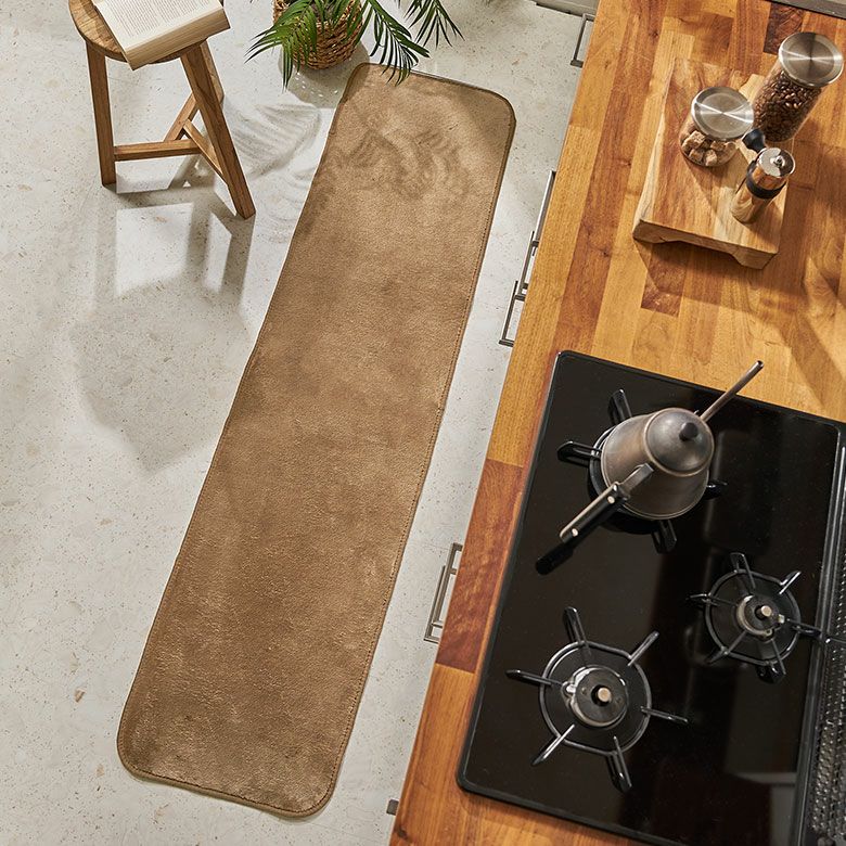 シンプルな無地のキッチンマットは、どんなインテリアにも合わせやすいアイテムです。家具の素材を選ばずにお使いいただけますが、特に自然素材や木材の家具との相性が抜群です。
