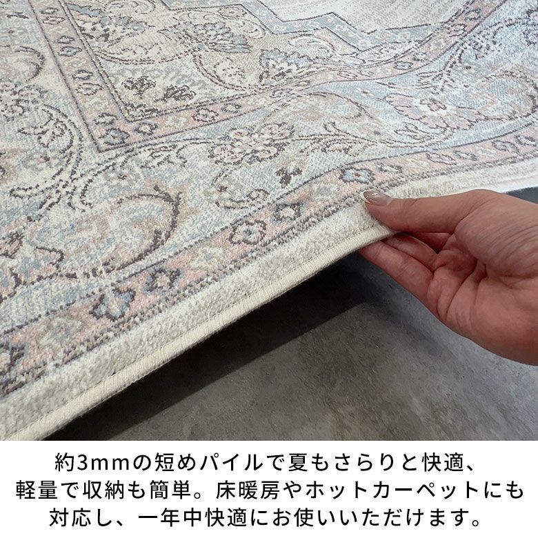 パイル長約3mmの薄手で夏もさらりと快適、軽量で収納も簡単。床暖房やホットカーペットにも対応し、一年中快適にお使いいただけます。使い始めは柔らかな毛羽立ちが感じられますが、使い込むほどに落ち着き、上品な光沢と滑らかさが際立ちます。