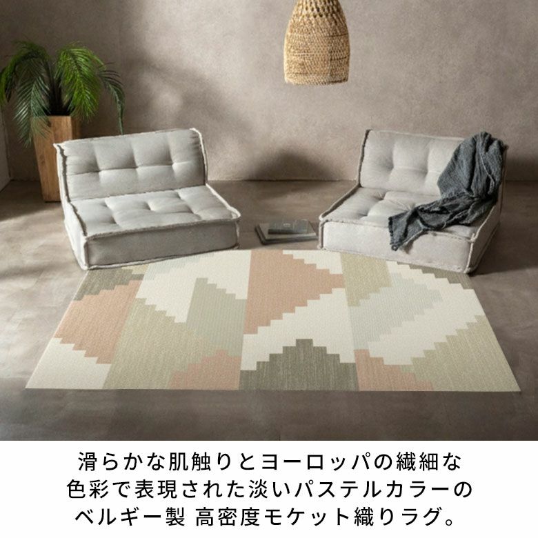 ヨーロッパらしい洗練されたデザインと美しい発色が魅力のRAGOLLEモケット織りラグ シルクのような肌触りとヨーロッパの繊細な色彩で表現された淡いアースカラーの幾何学模様 ベルギー製 高密度モケット織り ラグマット 約 135×195cm ジオメトリック柄 ラグ カーペット おしゃれ 絨毯 ビスコース アジア工房 [84391]