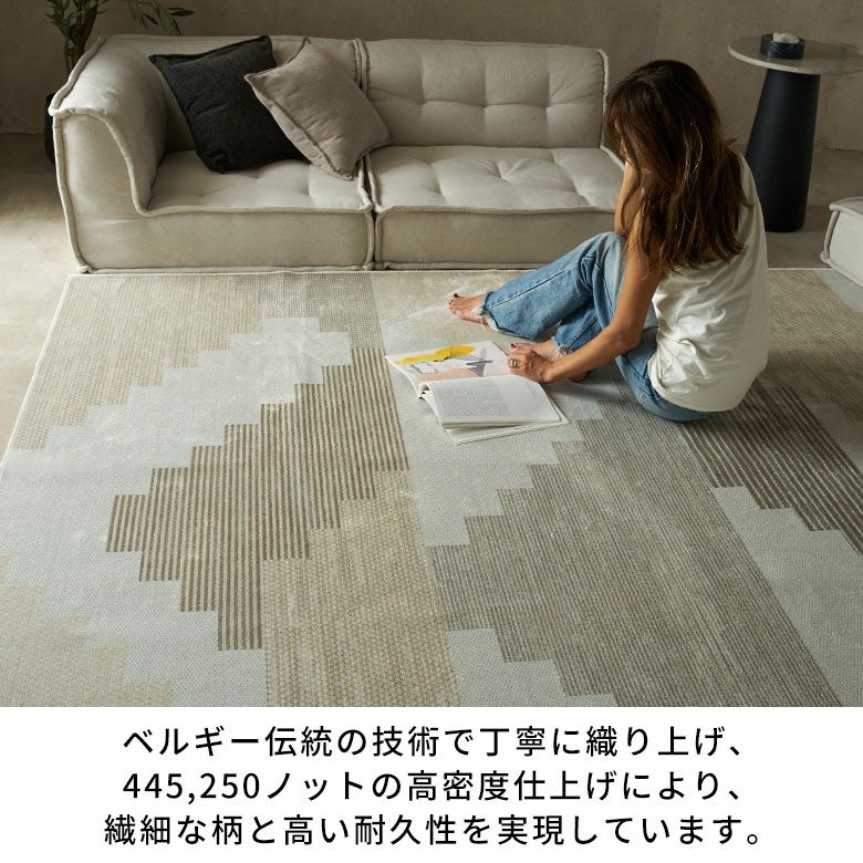 ベルギーラグは、中世から続く織物文化と最新の機械織技術が融合した上質なラグです。ベルギーならではの繊細な柄表現とニュアンスのある美しいカラーが生み出す上品なデザインが魅力。