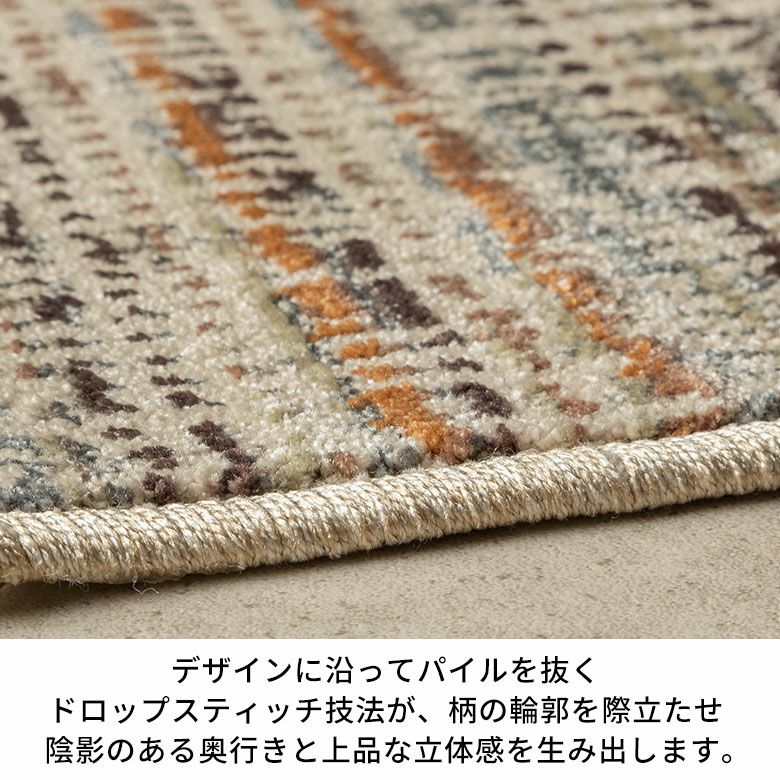 一方、ウィルトン織ラグは、色付きのパイル糸を組み合わせて模様を作るため、 発色が美しく色褪せにくいのが特徴です。さらに、光の当たり方や見る角度によって陰影が生まれ、立体感のある美しいデザインを楽しめます。