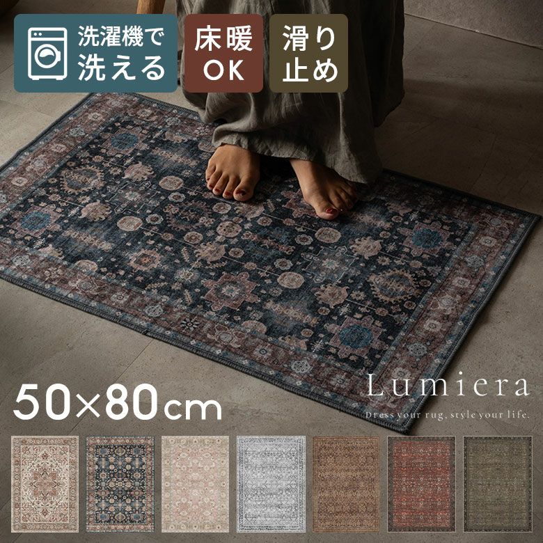 ヴィンテージラグの風合いを“手軽に・清潔に”楽しめるラグマット「Lumiera ルミエラ」シリーズ。繊細な模様と深みのある色合いを転写プリントでリアルに再現し、本物のような重厚感と高級感を実現しました。