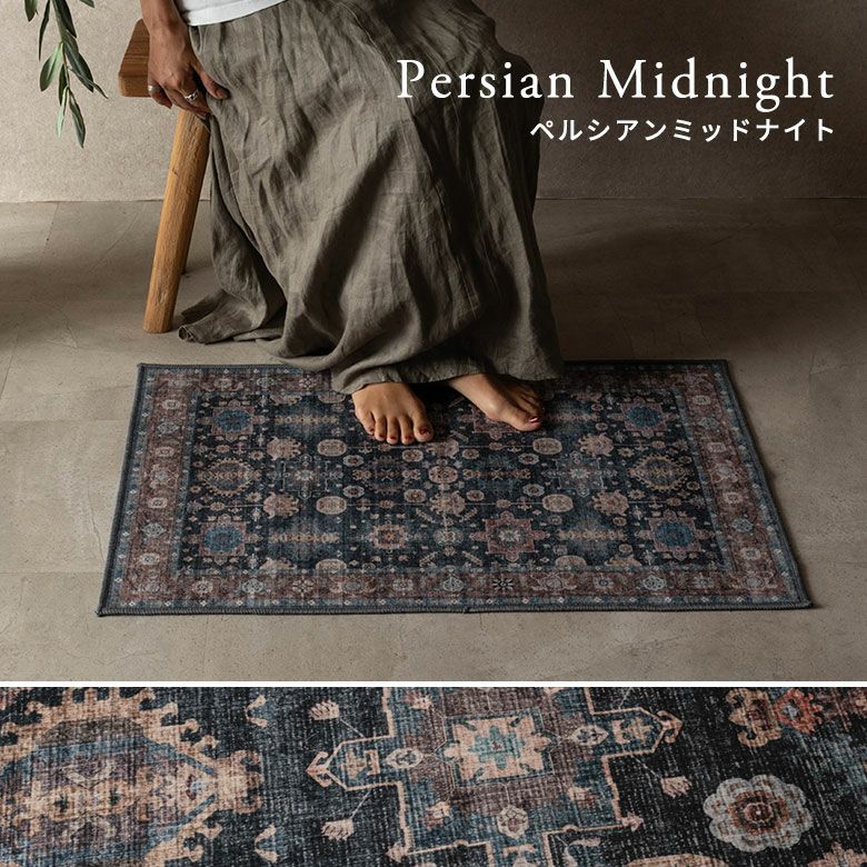 本物のヴィンテージラグのような、かすれや色ムラまで美しく再現。転写プリントならではの繊細な柄と深みのある発色で、お部屋を上品に彩ります。落ち着いたトーンと高級感のあるデザインが、インテリアに自然になじみます。