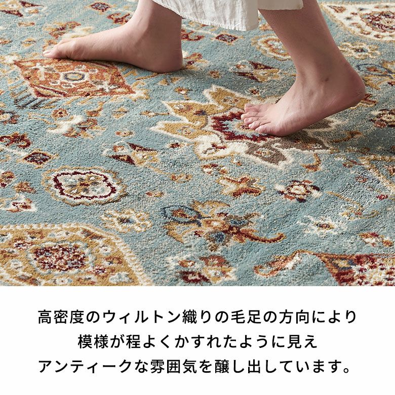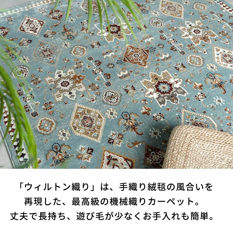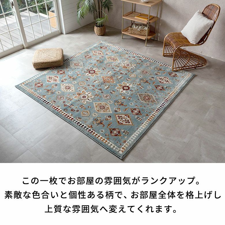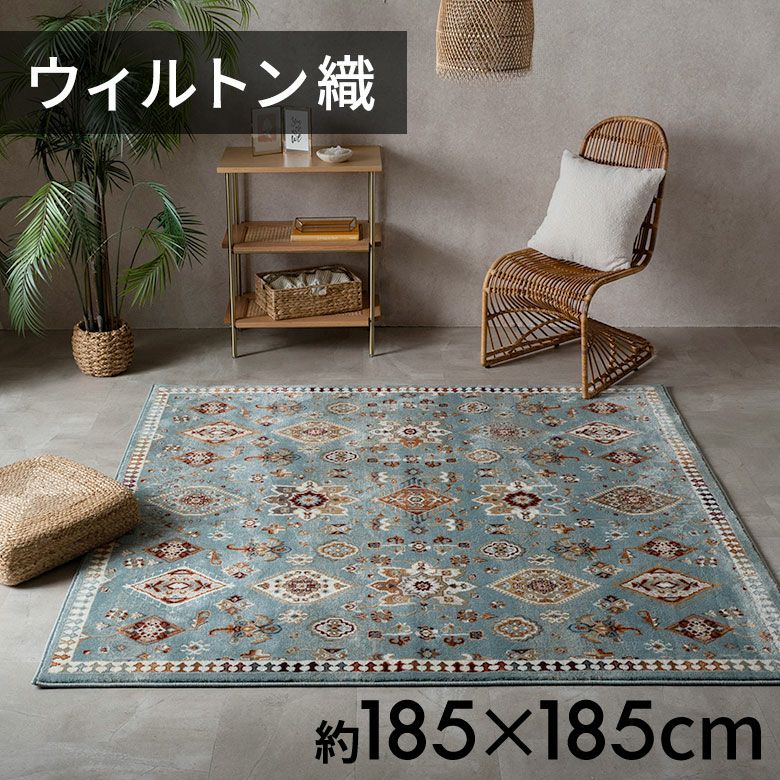 他の画像を見る 個性ある柄とくすみミントブルーが魅力。 敷くだけで、空間をセンスアップ! エキゾチック クラシックデザイン ペルシャ絨毯風 185x185cm ウィルトン織り [eg84374] 販売価格 ¥ 11,900 税込 在庫切れ 詳細を見る お気に入りに登録する