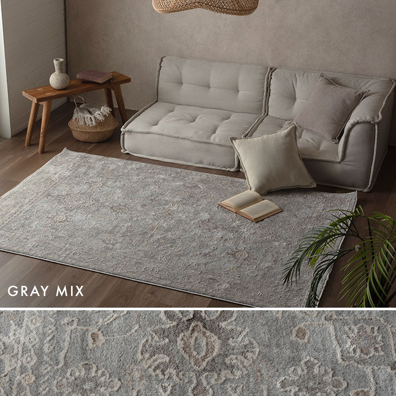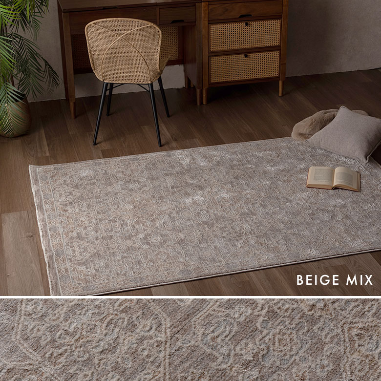 ニュアンスカラーが上品な印象のオリエンタル柄デザインラグ。上品なクラシック幾何学の「ベージュミックス」と、現代風にアレンジしたオリエンタル柄の「グレーミックス」の2タイプ。どちらも合わせやすい色合いで、ナチュラル・北欧・シャビーシックなど幅広いインテリアにマッチします。