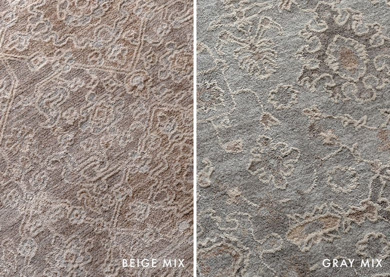 柄はベージュ系カラーのベースにクラシックな幾何学模様をあしらった総柄デザインの「ベージュミックス」と、グレー系カラーのベースにオリエンタル文様をモダンにアレンジしたボーダーデザインの「グレーミックス」の2種類。どちらも敷くだけで空間を格上げしてくれる、繊細で上品なデザインです。
