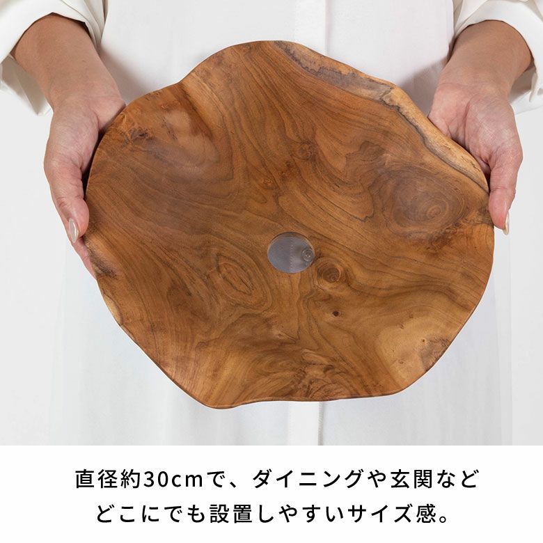 一枚板のチーク無垢材から彫り出した贅沢な逸品です。ラッカー塗装などの樹脂塗装に頼らず、食品用の安全基準を満たしたオイルのみで仕上げているため、天然木そのものの手触りをお楽しみいただけます。使うほど色艶が深まり、年月と共に表情が変わるのも魅力。ほどよい存在感のある直径約30cmサイズで、1個使いはもちろん、贅沢に複数並べるのもおすすめです。