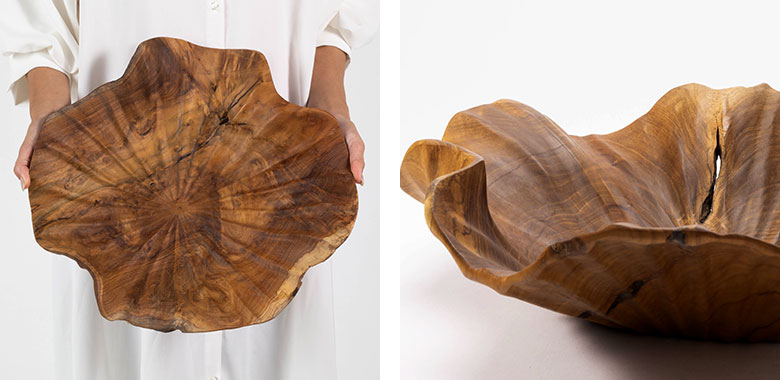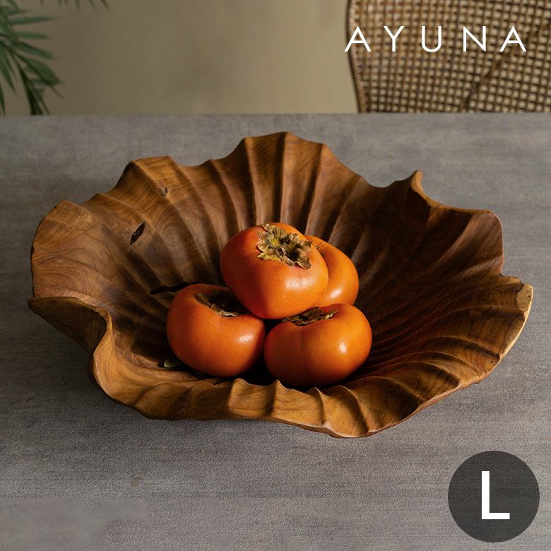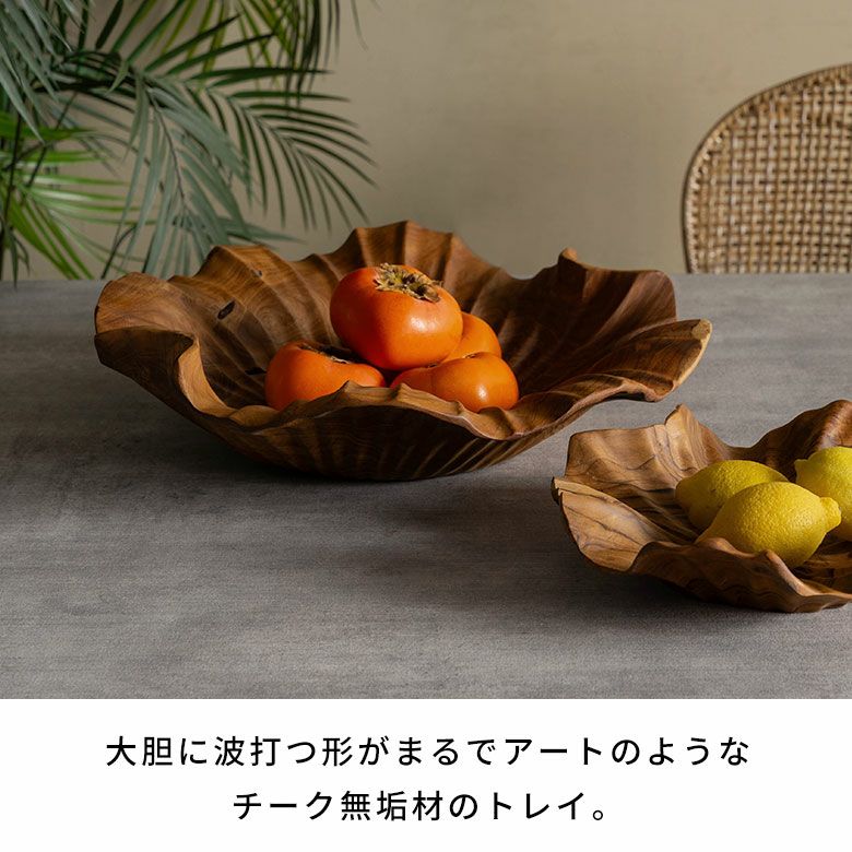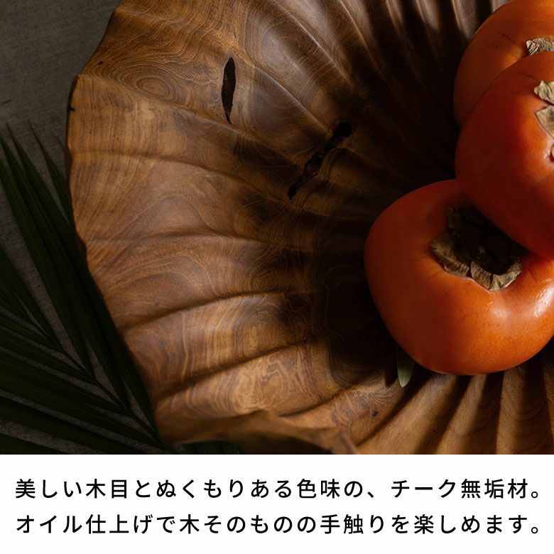 一枚板のチーク無垢材から彫り出した贅沢な逸品です。ラッカー塗装などの樹脂塗装に頼らず、食品用の安全基準を満たしたオイルのみで仕上げているため、天然木そのものの手触りをお楽しみいただけます。使うほど色艶が深まり、年月と共に表情が変わるのも魅力。存在感のある約40×40cmサイズで、果物やパンを盛り付けるトレイとしてや、テーブルの中心に置くセンターピースとして空間の主役になります。