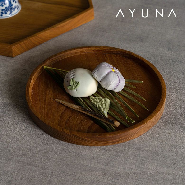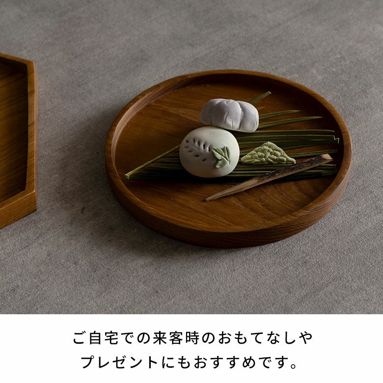 小さめのお茶菓子を載せて、和のお茶時間に。同シリーズの六角形トレイ(写真左)と組み合わせると、統一感が生まれ、さらに特別感のあるコーディネートに。シンプルな円形なので、洋風のテーブルコーディネートにも。