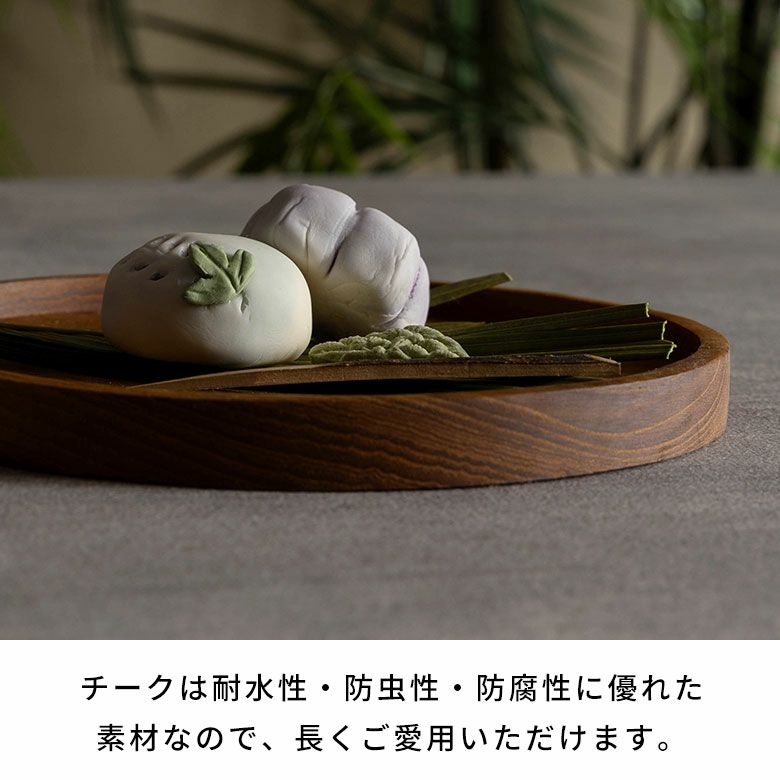 縁が少し立ち上がったつくりなので、蚊取り線香やお香用のプレートとしてもおすすめです。真鍮製の蚊取り線香ホルダーやお香立てを組み合わせれば、チークと真鍮のコントラストが際立ち、上質で洗練された空間を演出します。