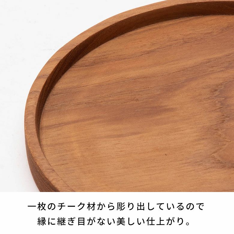 一枚板のチーク無垢材から彫り出した贅沢な逸品です。ラッカー塗装などの樹脂塗装に頼らず、食品用の安全基準を満たしたオイルのみで仕上げているため、天然木そのものの手触りをお楽しみいただけます。使うほど色艶が深まり、年月と共に表情が変わるのも魅力。コンパクトな直径約17cmの円形で、コースターや小物トレイなど、使い方は様々。日々の暮らしに自然と溶け込む万能アイテムです。