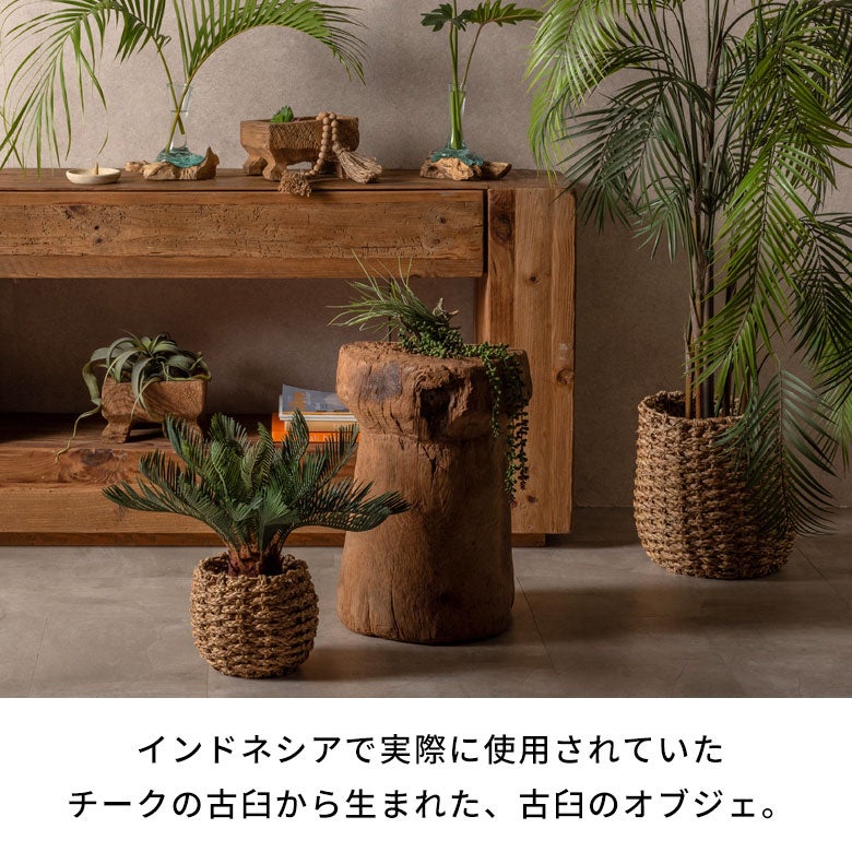 かつてインドネシアの農村で穀物を挽くために使われていた、チーク無垢材の古い臼。その役目を終えた木材を自然の中に戻し、さらに土壌で1~2年かけて朽ちさせることで、独特のラスティックな風合いを引き出したアップサイクルの木製オブジェです。