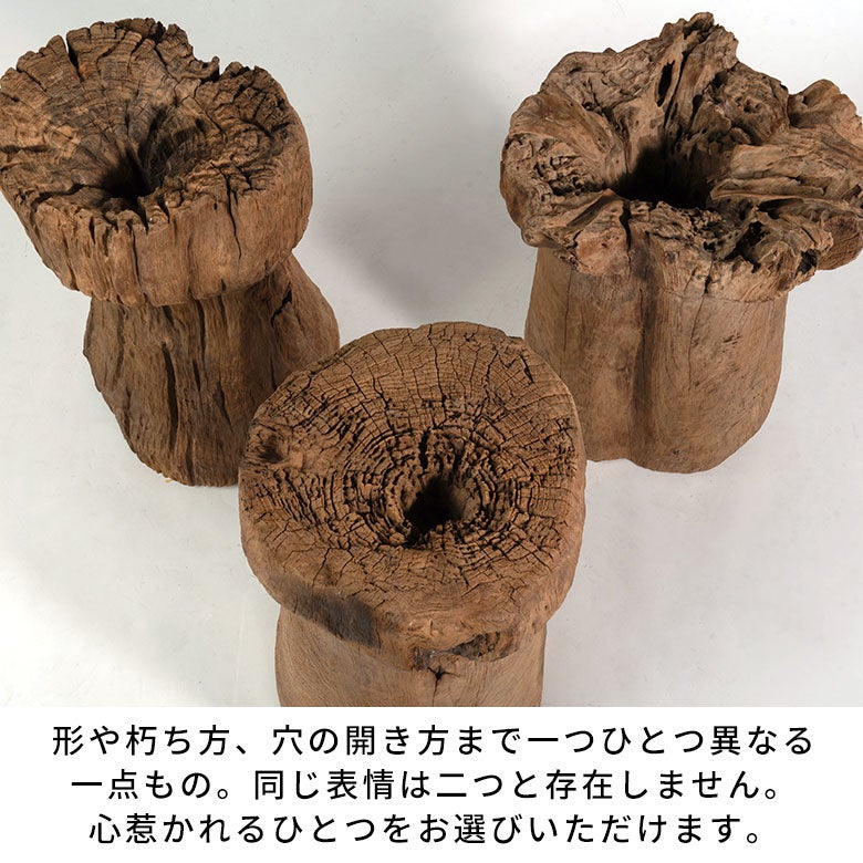 元の臼をひっくり返して仕立てているため内部は大きく空洞になっており、個体によっては穴が貫通しているものもあります。直径約32~51cm、高さ約44~57cmと個体差のある大型サイズは、置くだけで空間の印象を変えるボリューム。リビングや玄関はもちろん、店舗やホテル空間のアートピースとしても映えます。