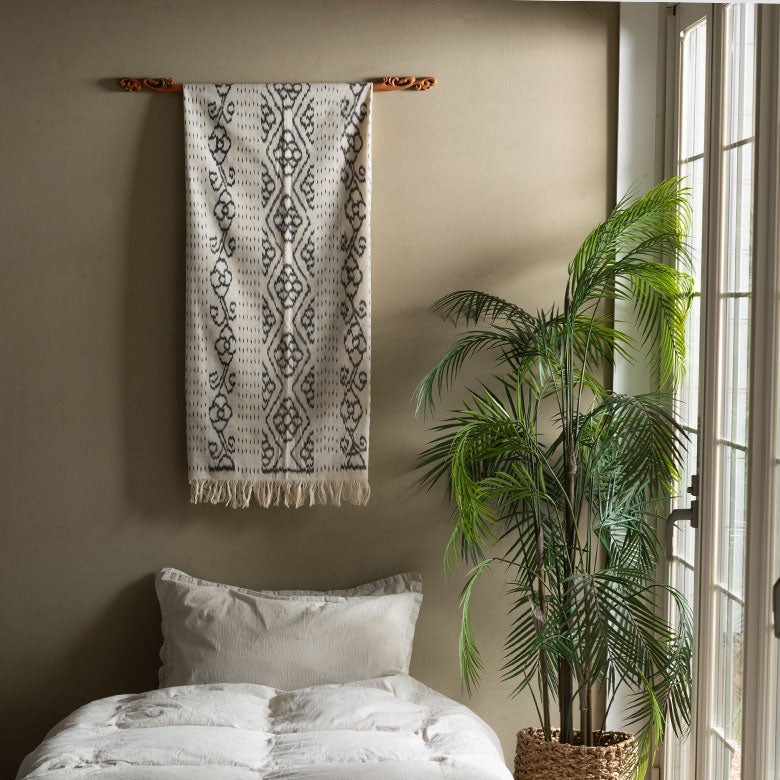 イカットは、バリ島のヴィラのようなインテリアを演出するうえで欠かせないファブリック装飾。壁に掛けるだけで、空間全体にアジアンリゾートの穏やかな雰囲気が広がります。