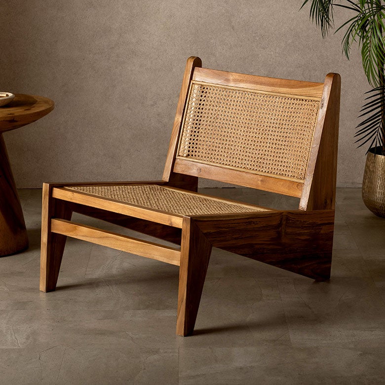 ピエール・ジャンヌレ(Pierre Jeanneret)が手掛けた名作家具カンガルーチェアーのリプロダクト品(復刻品)。チーク無垢材とラタンを使用し、優れた通気性と弾力性を持つサステナブルな天然素材で作られたラウンジチェアーです。