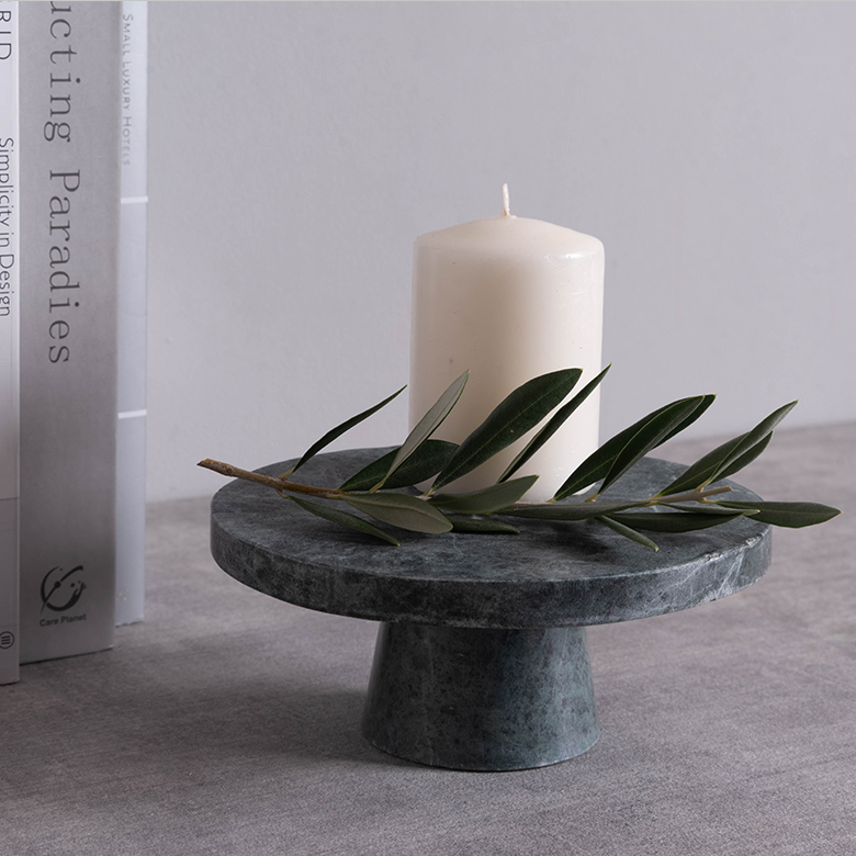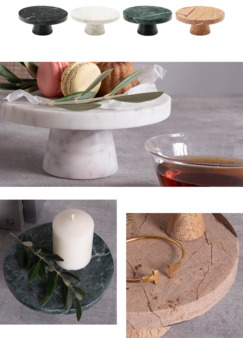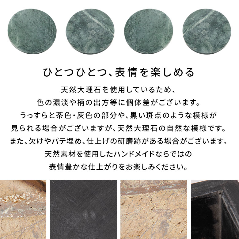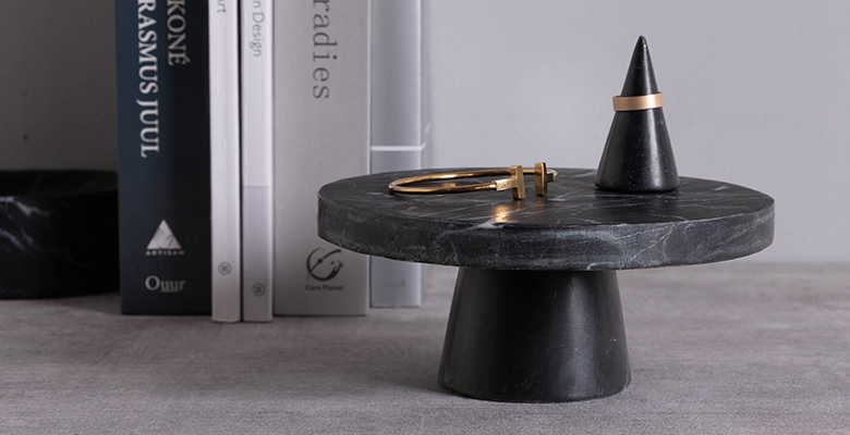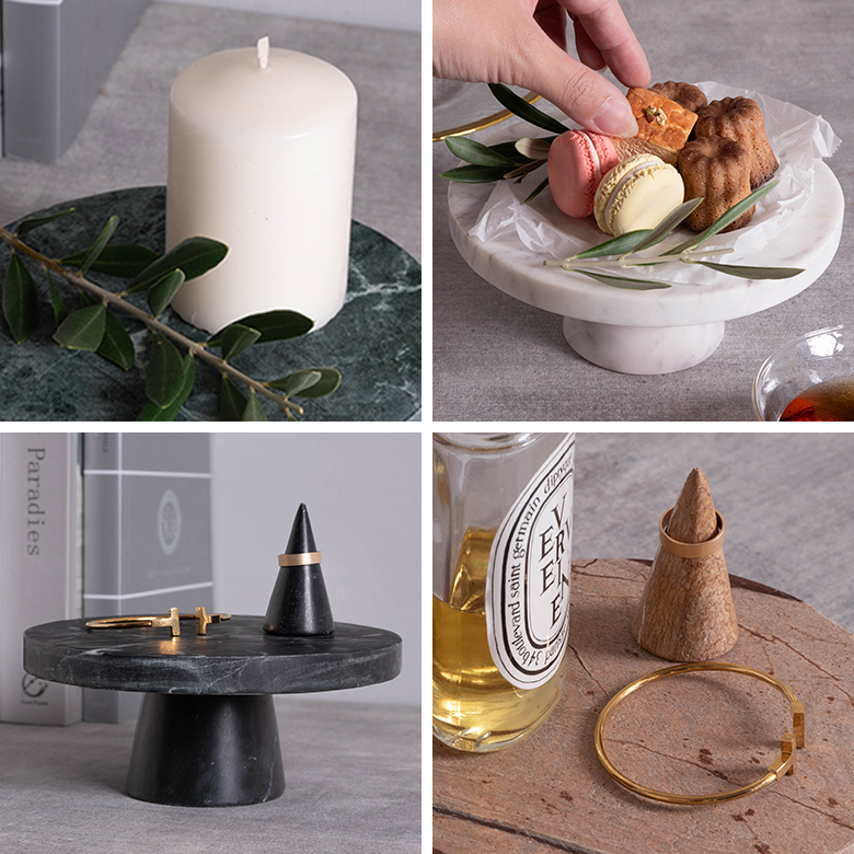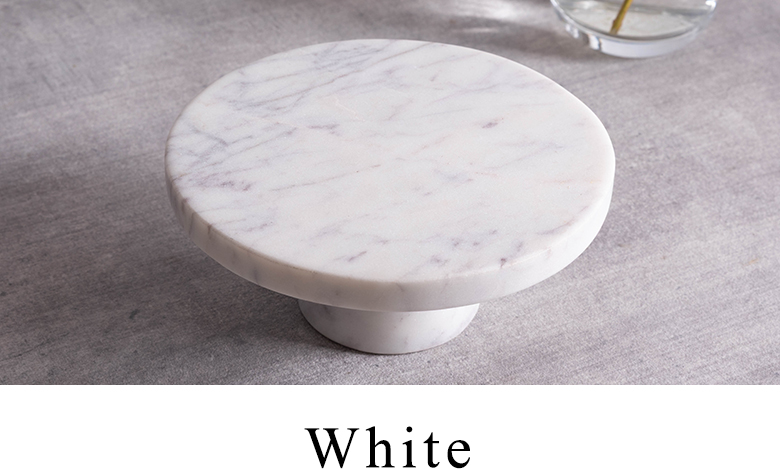 カラーバリエーションはブラック・ホワイト・グリーン・ブラウンの全4色。天然石ならではの豊かな表情を楽しめるコンポートトレイは、置くための器であると同時に、空間を格上げする小さなインテリアオブジェです。