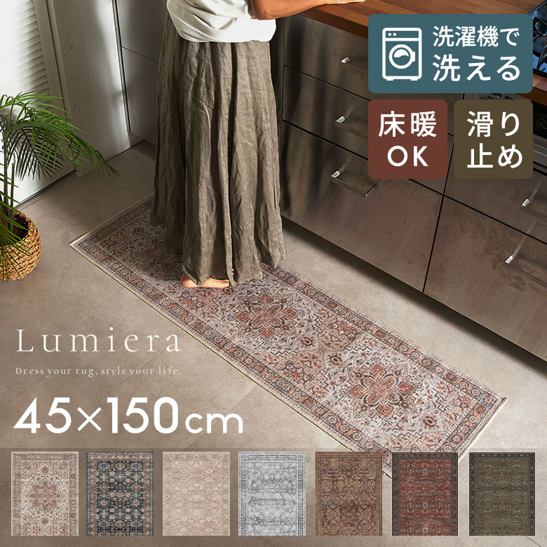 ヴィンテージラグの風合いを“手軽に・清潔に”楽しめるラグマット「Lumiera ルミエラ」シリーズ。繊細な模様と深みのある色合いを転写プリントでリアルに再現し、本物のような重厚感と高級感を実現しました。