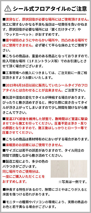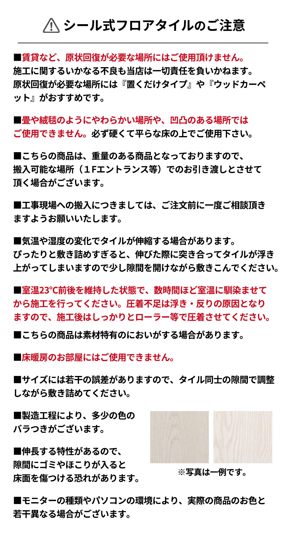 こちらは、あらかじめ接着剤の付いた、台紙をはがしてペタっと床に貼るだけのシール式。厚みは1.2mm、薄くて軽い仕様なので女性でもラクに施工できます。ノコギリや接着剤などの特殊な道具は不要なので、初めての方でも安心です。コストを抑えて本格DIYを叶える、お手頃価格も嬉しいポイントです。
