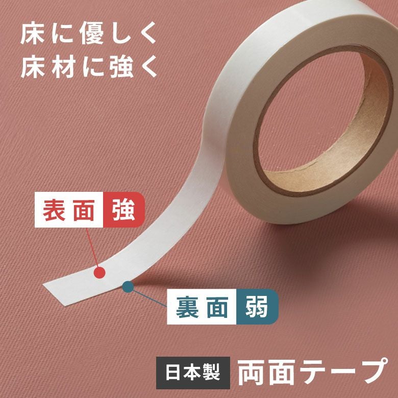 両面テープの表面は粘着力の強い仕様で、床材をしっかり固定。賃貸住宅での使用も考慮し、裏面は粘着力をやや抑えた強弱ハイブリッド設計です。床材のズレを防ぎながら、撤去時も不安なく剥がせる、固定力と扱いやすさの両立を実現しています。