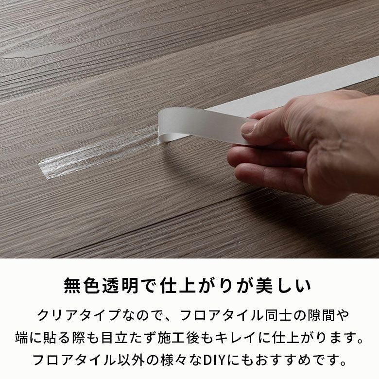 薄さ0.1mmの両面テープなので、上にフロアタイルを敷いても段差が出ず、厚みに響かない極薄タイプ。フロアタイルと床の間の浮きも少ないので、ドア前のフロアタイルの固定にも安心して使用できます。無色透明なので、フロアタイルの端や隙間の固定に使用してもキレイに仕上がります。