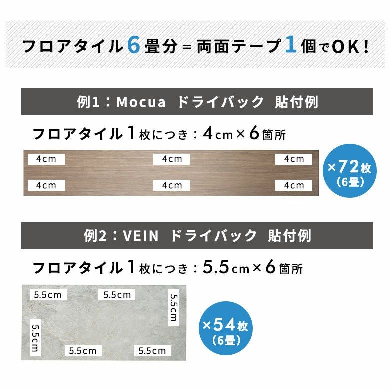 1巻でフロアタイル約6畳分施工可能。しっかり固定したい場合は2巻がおすすめです。綺麗に剥がせるため、賃貸の方やDIY初心者にぴったり。
