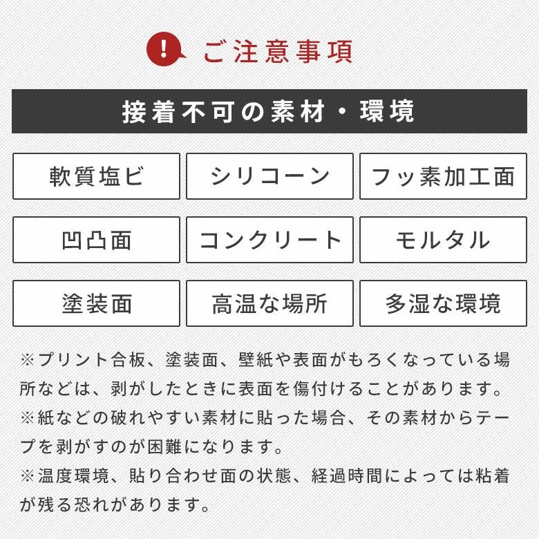 ※プリント合板、塗装面、壁紙や表面がもろくなっている場所などは、剥がしたときに表面を傷付けることがあります。