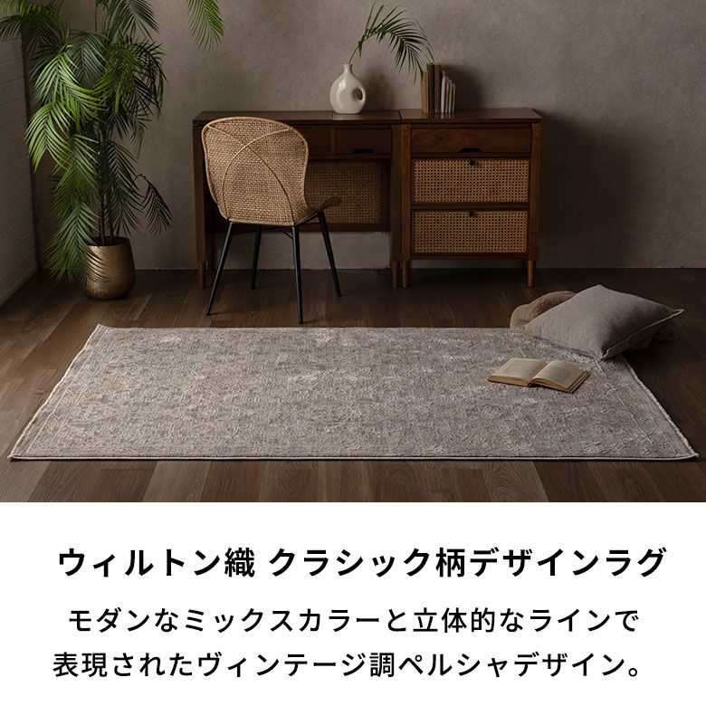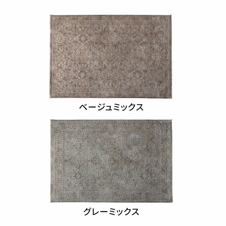 ニュアンスカラーが上品な印象のオリエンタル柄デザインラグ。上品なクラシック幾何学の「ベージュミックス」と、現代風にアレンジしたオリエンタル柄の「グレーミックス」の2タイプ。どちらも合わせやすい色合いで、ナチュラル・北欧・シャビーシックなど幅広いインテリアにマッチします。